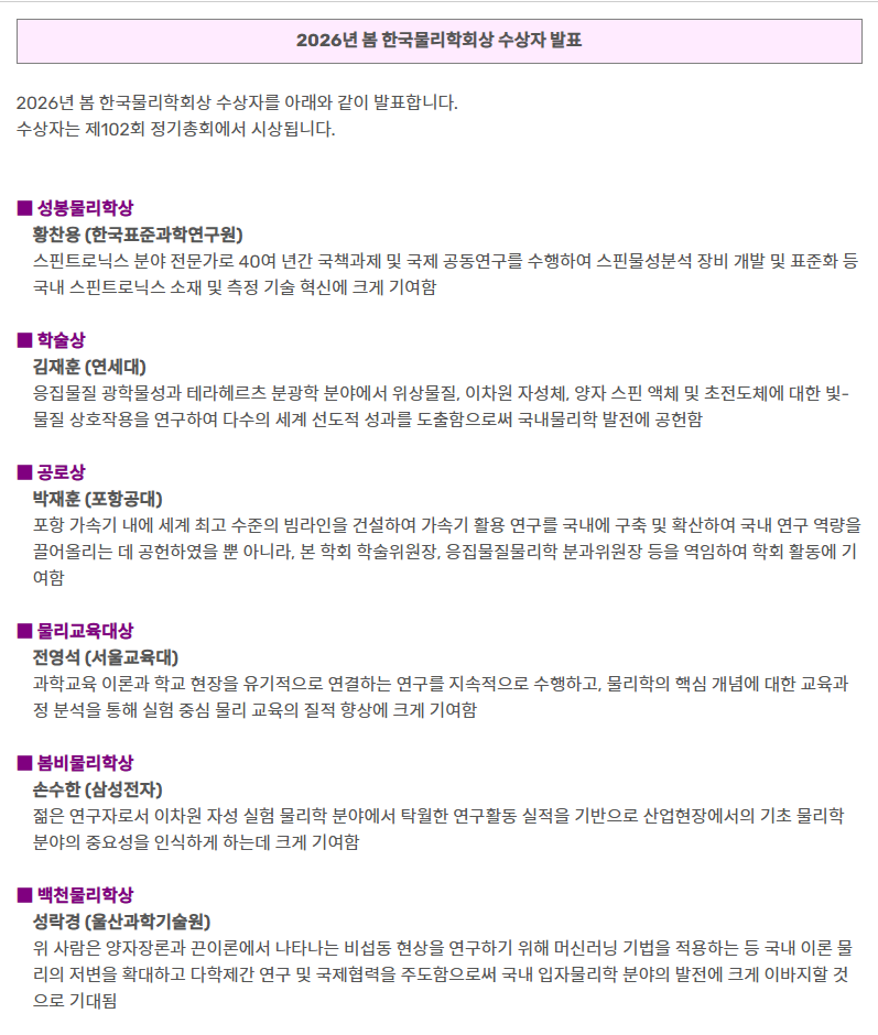 [수리과학과 성락경 교수] 한국물리학회 ‘백천물리학상’ 수상