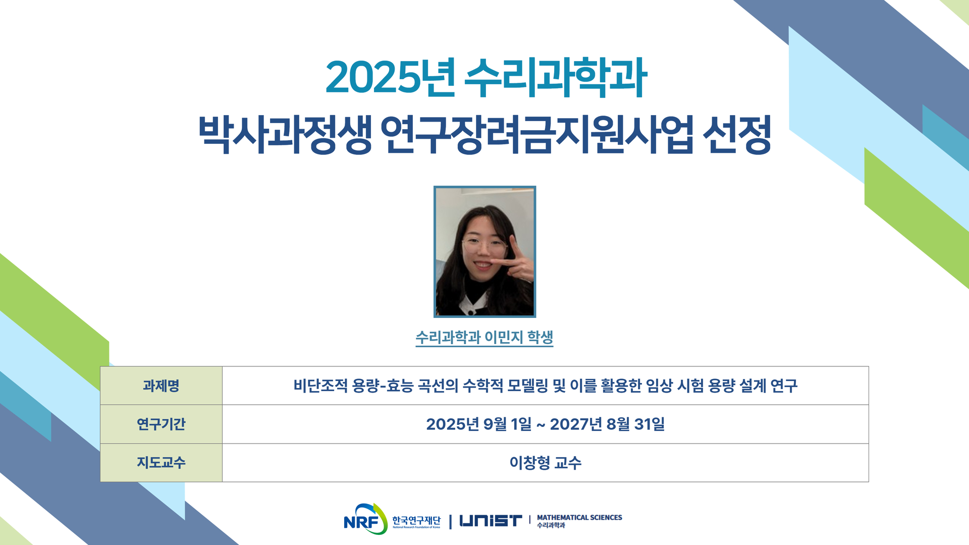 [홍보] 2025 박사과정생 연구장려금지원사업 선정(수리과학과 이민지 학생)