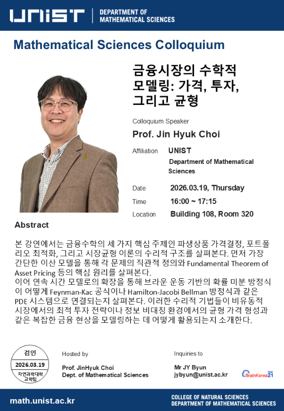 [Mathematical Sciences Colloquium] 금융시장의 수학적 모델링: 가격, 투자, 그리고 균형 2026.03.18 Date 2026-03-19 (16:00 ~ 17:15) Location Building 108, Room 320